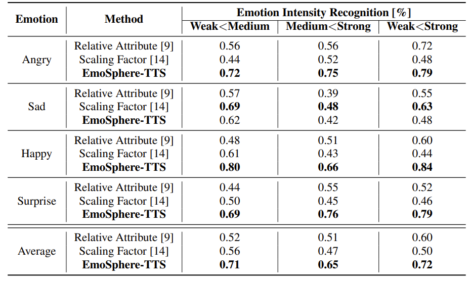 - 전체적인 성능 측면에서 EmoSphere-TTS가 가장 우수한 성능을 달성함