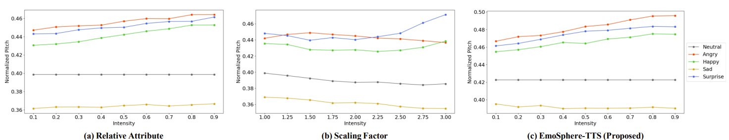 - 반면 EmoSphere-TTS는 주어진 intensity scale에 따라 적절한 pitch를 모델링함