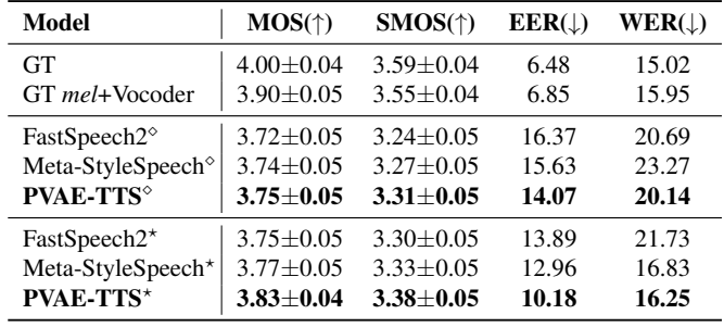 - Zero-shot $^{\lozenge}$, few-shot $^{\star}$ adaptation측면에서도 PVAE-TTS의 성능이 가장 뛰어남