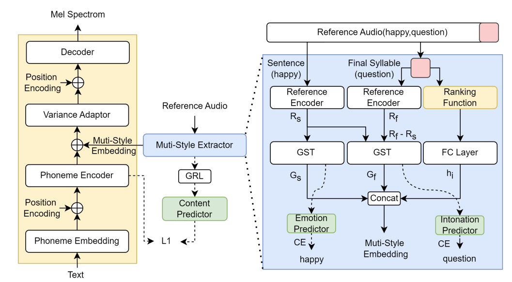 - 따라서 논문은 duration variance와 intonation-related feature를 capture 하기 위해 final syllable을 포함하는 audio의 last 0.52초를 intonation으로 모델링함 - 추가적으로 reference speech에서 emotion, intonation information을 추출하기 위해 multi-style extractor를 도입함