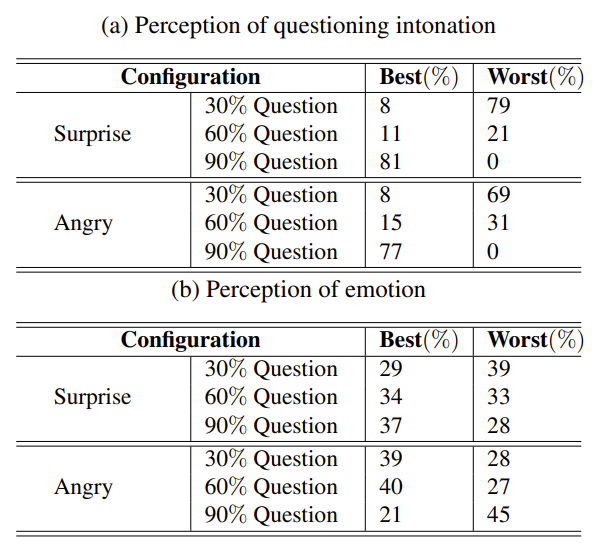- Emotion embedding은 'angry statement', 'angry question' 같이 emotion과 intonation 간의 mutually exclusive combination을 동시에 모델링하지 못하기 때문 - 특히 speaker는 questioning intonation을 사용하여 delcarative question 형식으로 statement를 제시할 수 있음