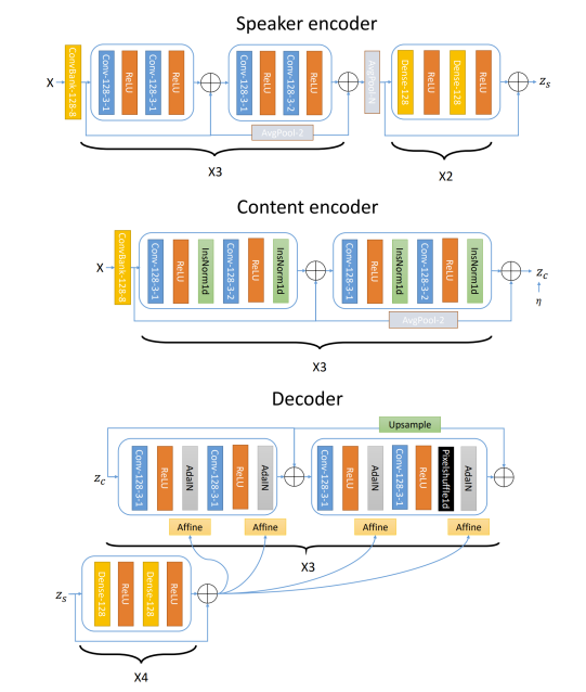 - Instance normalization layer는 content encoder에서 global information을 normalize 하는 데 사용됨 - PixelShuffle1D layer는 decoder에서 upsampling을 수행하는데 사용되고, AdaIN layer는 global information을 decoder에 제공함
