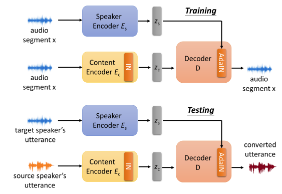 - AdaIN-VC는 factorization을 통해 다음과 같이 one-shot VC를 수행함