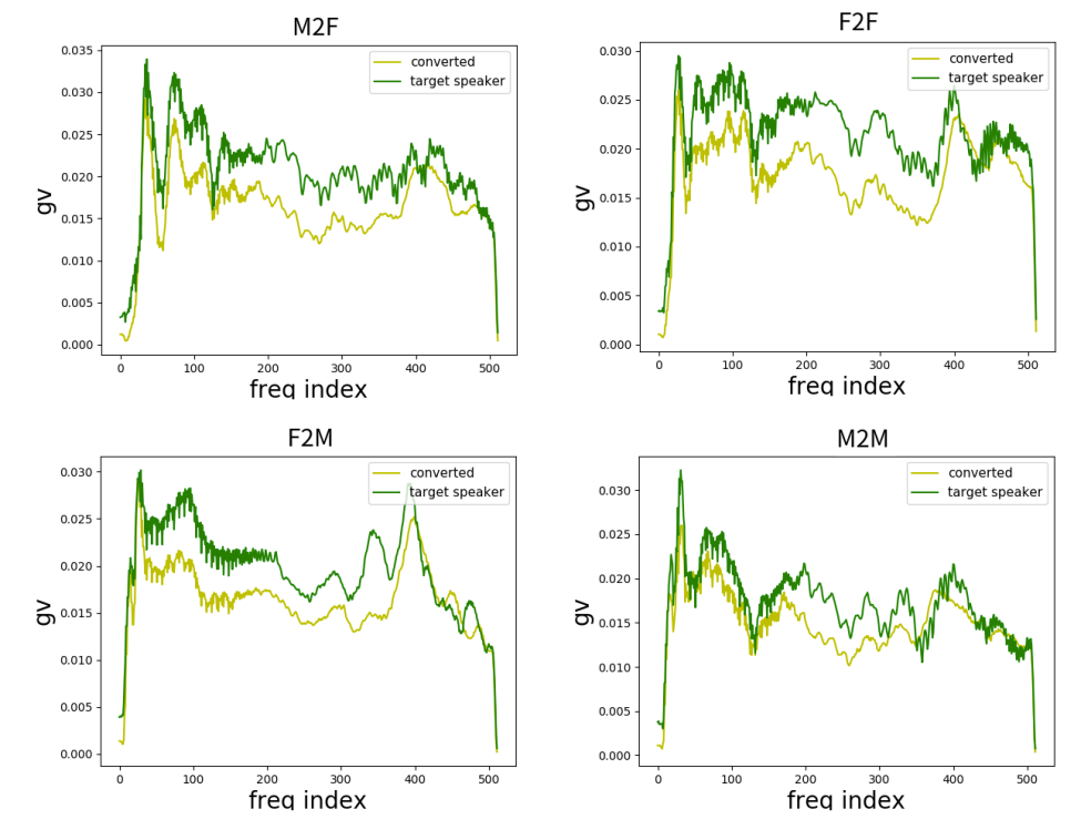 - Global variance, spectrogram 모두에서 AdaIN-VC는 phonetic content를 유지하면서 효과적인 conversion을 수행하는 것으로 나타남