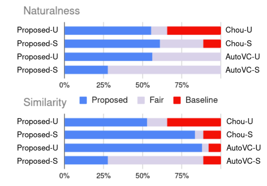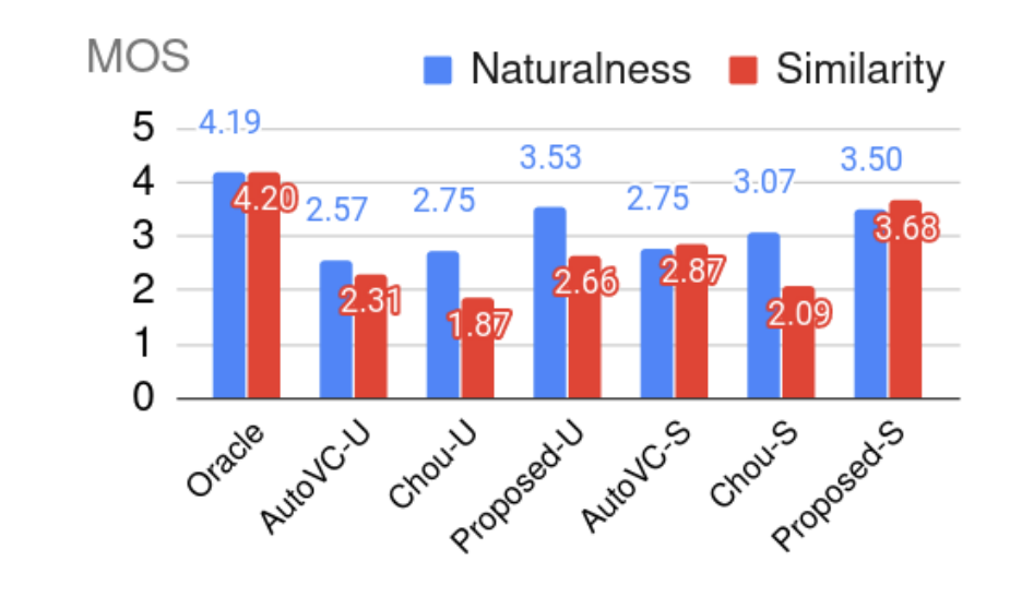 - MOS 측면에서 VQVC+는 unseen (-U), seen (-S) 모두에서 가장 우수한 성능을 달성함