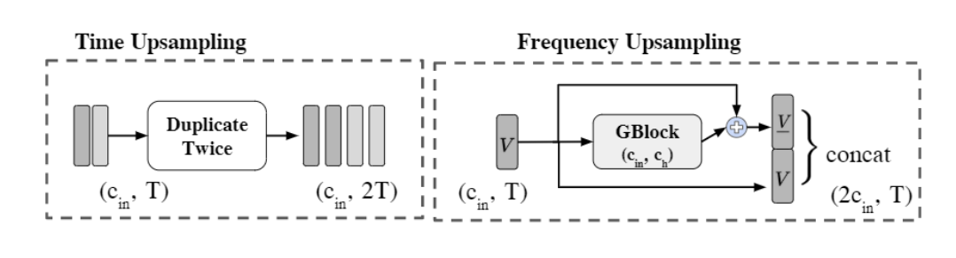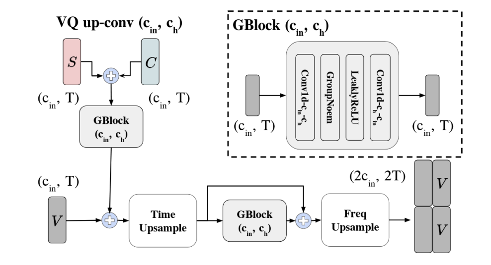 - 이때 embedding은 time, frequency domain 모두에서 2배로 upsampling 됨 - 구조적으로 VQ Up-Conv는 Group Norm Block (GBlock), TimeUpsampling, FreqUpsampling으로 구성됨