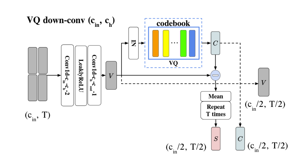 - $\mathrm{Conv1d\text{-}c_{1}\text{-}c_{2}\text{-}N}$ : 1D convolution layer, $c_{1},c_{2}$ : 각각 input/output channel, $N$ : stride - $\mathrm{VQ\,down\text{-}conv(c_{in},c_{h})}$는 dimension이 $(c_{in},T)$인 matrix를 input으로 하고 $\mathbf{V},\mathbf{C},\mathbf{S}$를 output 함