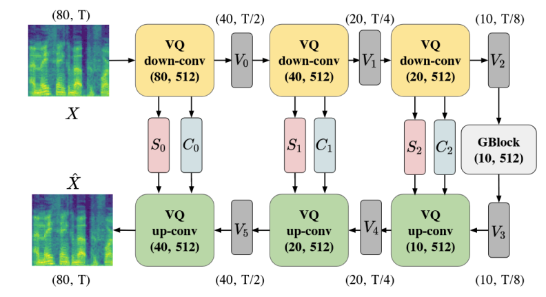 - 이후 $\mathbf{V}$는 다음 VQ Down-Conv module을 통과하고 $\mathbf{C}, \mathbf{S}$는 decoder의 VQ Up-Conv module을 통과함