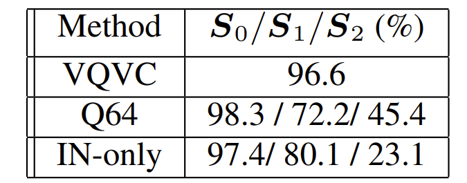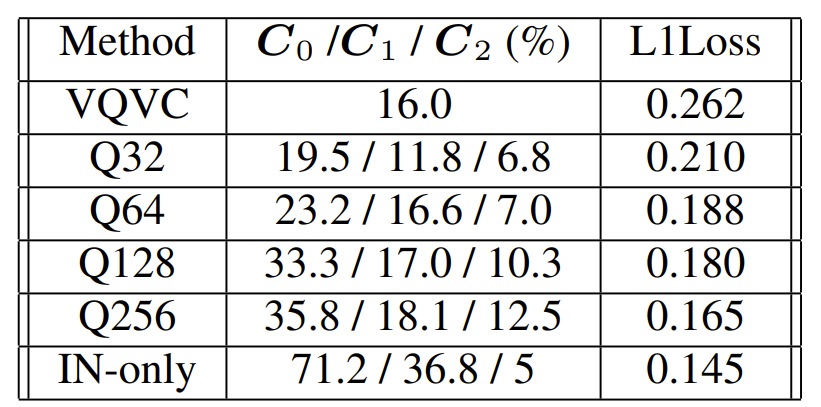 - 즉, IN-only model은 content와 speaker information을 disentangle 하는 ability가 없고 단순히 source audio를 reconstruct 함 - Codebook size의 경우 information bottleneck의 강도를 결정함