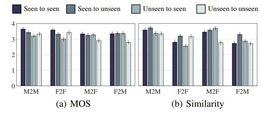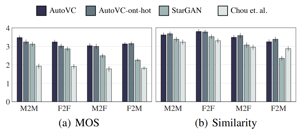 - Many-to-Many conversion 측면에서 AutoVC가 가장 우수한 MOS를 달성함