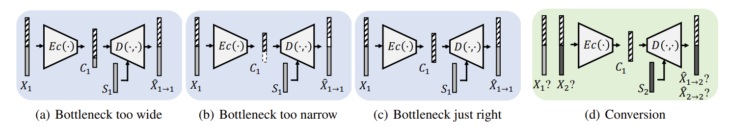 - (Eq. 2)의 AutoEncoder-based training은 information bottleneck으로 인해 ideal voice conversion을 수행할 수 있음