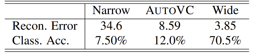 - AutoVC는 reconstruction error, accuracy 측면에서 최적의 결과를 달성함