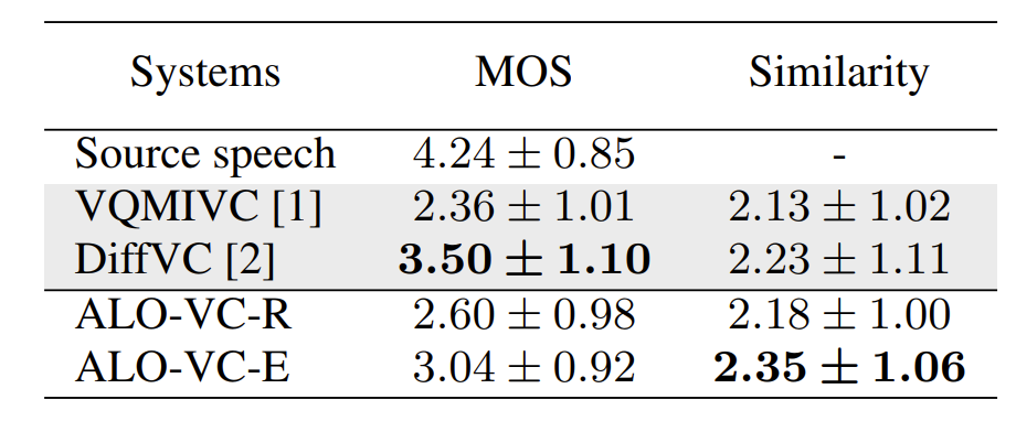 - Objective test에서도 ALO-VC가 가장 우수한 naturalness와 similarity를 달성함