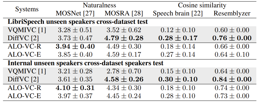 - ALO-VC-R은 pre-trained d-vector speaker encoder를 활용하고 ALO-VC-E는 ECAPA-TDNN을 활용해 성능을 개선