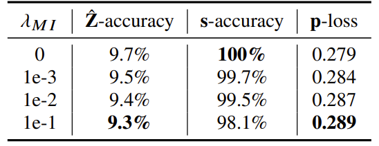 - 특히 $\lambda_{MI}$가 클수록 $\mathbf{s}$는 speaker information을 lose 함
