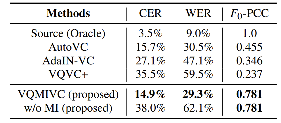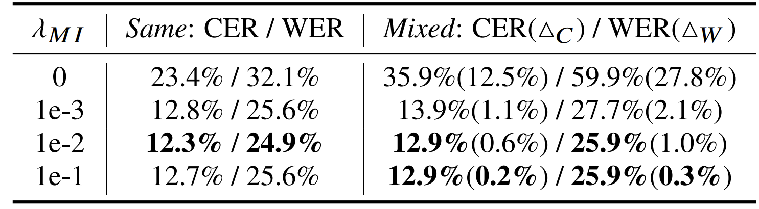 - ASR system에 대해 MI가 사용되지 않은 ($\lambda_{MI}=0$) 경우, 생성된 speech는 높은 $\Delta_{C}, \Delta_{W}$ 값을 가짐