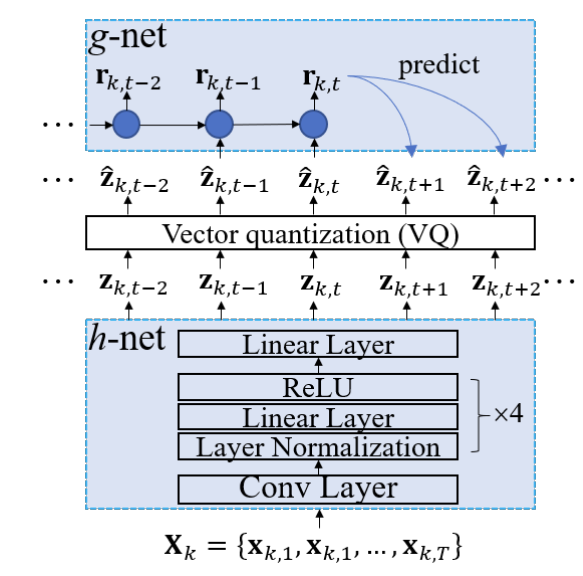 - $\text{sg}(\cdot)$ : stop-gradient operator - 추가적으로 $\hat{\mathbf{Z}}_{k}$가 local structure를 capture 할 수 있도록, RNN-based $g$-net을 활용해 $\hat{\mathbf{Z}}_{k}$에 대한 aggregation $\mathbf{R}_{k}=\{\mathbf{r}_{k,1},\mathbf{r}_{k,2},...,\mathbf{r}_{k,T/2}\}$를 얻는 Contrastive Predictive Coding (CPC)를 도입함