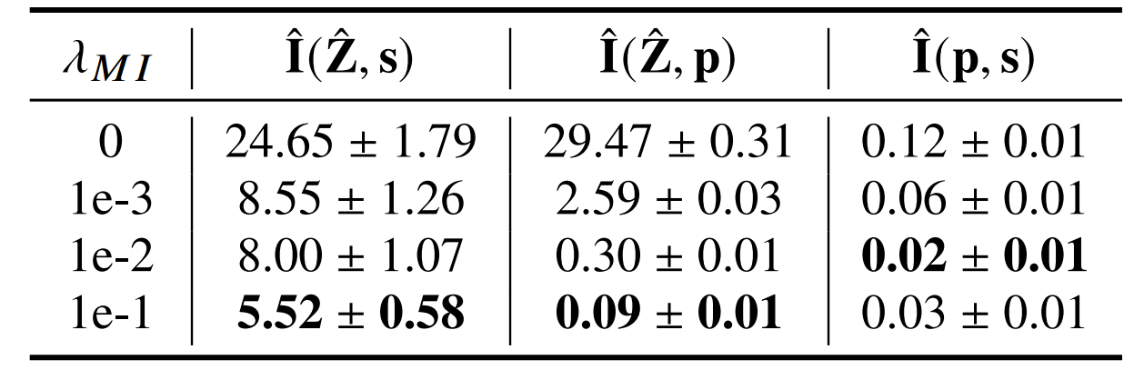 - $\lambda_{MI}$ : MI loss가 disentanglement를 enhance 하는데 대한 constant weight