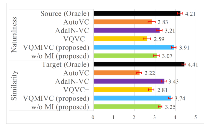 - MOS 측면에서도 VQMIVC가 가장 우수한 naturalness와 similarity를 달성함