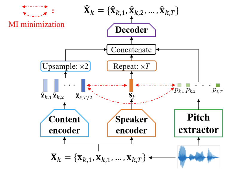 - Content encoder, speaker encoder, pitch extractor는 각각 input speech로부터 content/speaker/pitch representation을 추출함