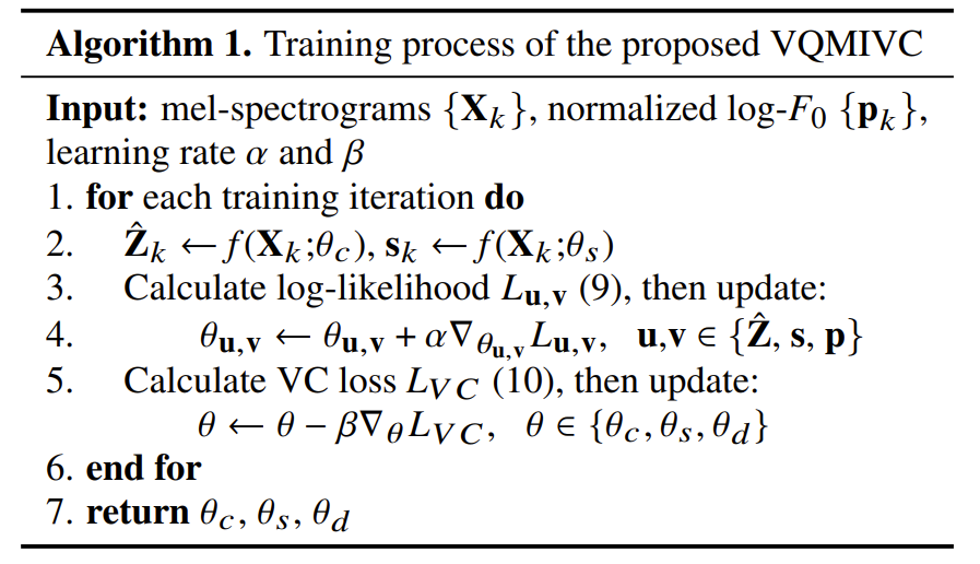 - 결과적으로 VQMIVC는 아래의 [Algorithm. 1]을 통해 training 됨