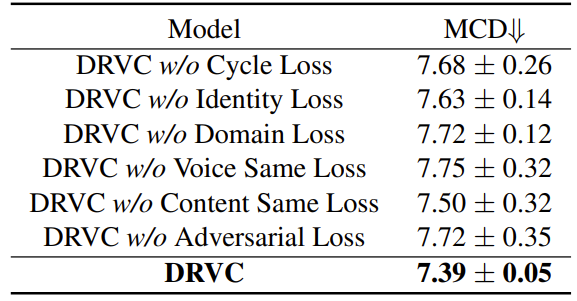 - Discriminator는 real $A$ speech $a$, real $B$ speech $b$, fake $A$ speech $\tilde{a}$, fake $B$ speech $\tilde{b}$를 통해 train 됨 - 결과적으로 DRVC의 total objective는: