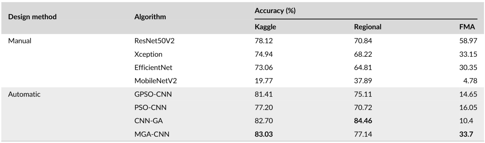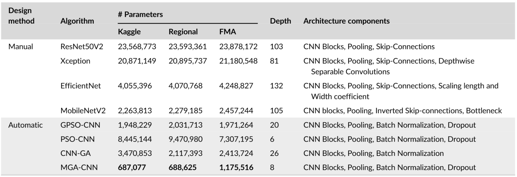 - MGA-CNN : MFCC feature를 활용해 최적의 CNN architecture를 찾아내는 GA 기반 접근법