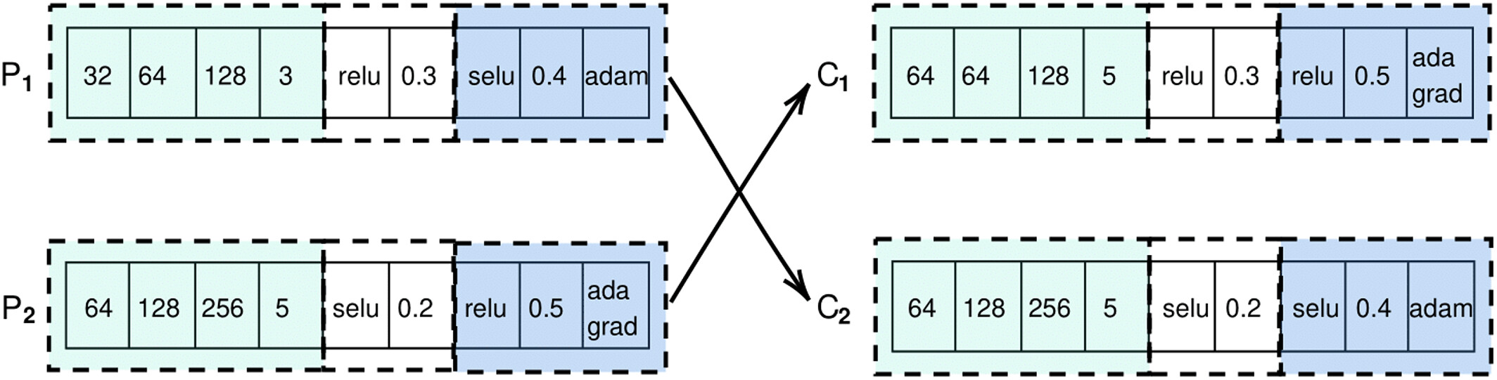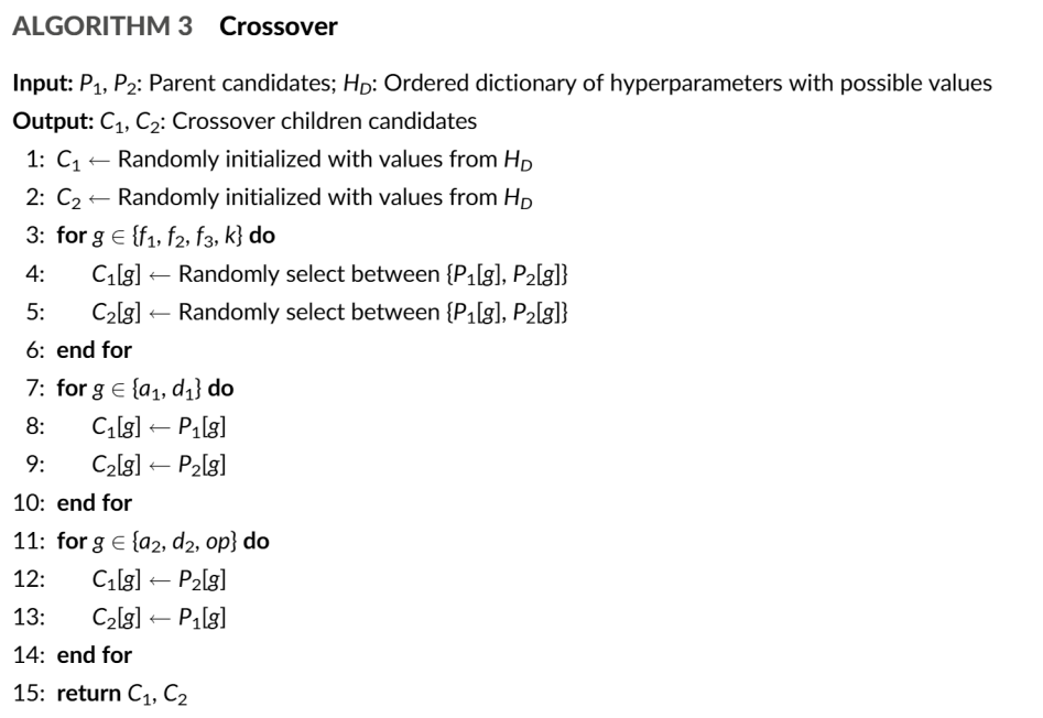 - Candidate model architecture의 offspring generation은 parent architecture의 crossover로 진행됨