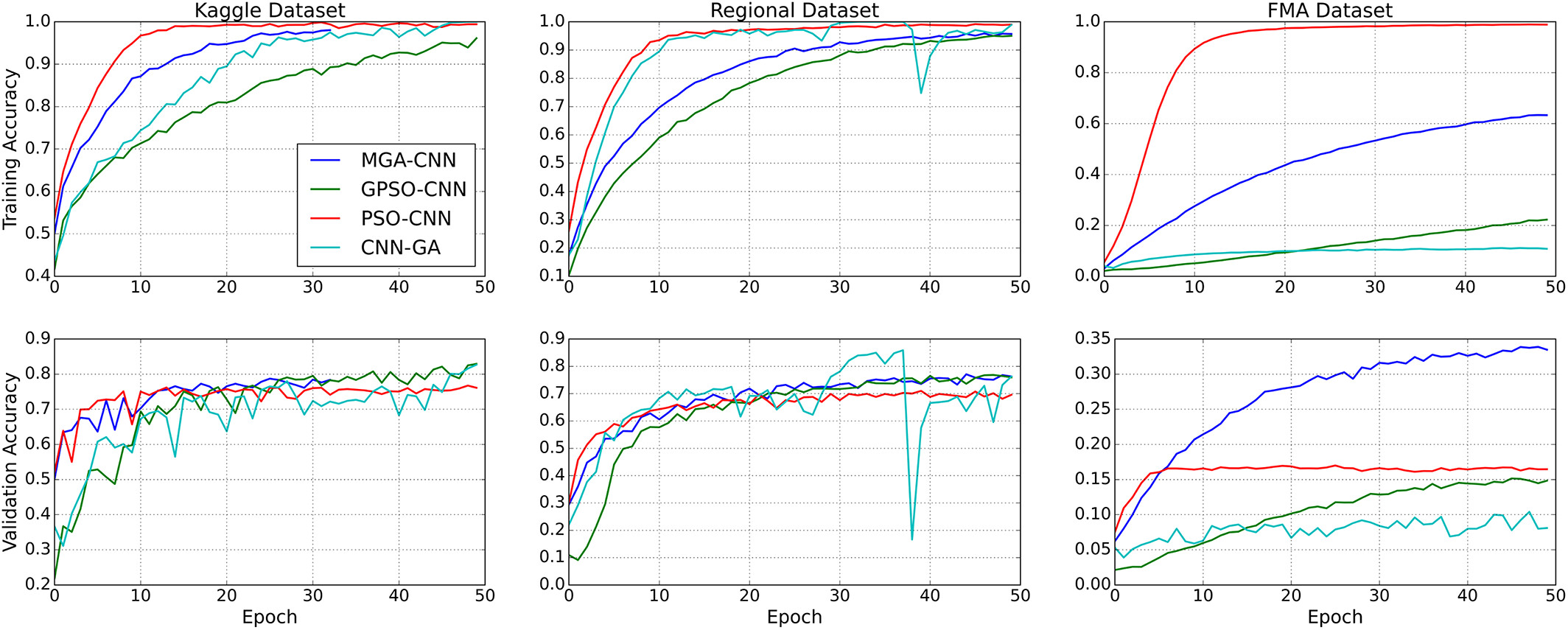 - PSO-CNN은 FMA trainset에서 높은 accuracy를 보였지만 validation set에서는 overfitting으로 인해 낮은 성능을 보임