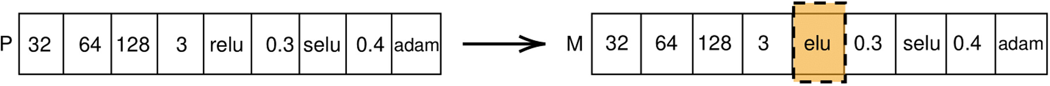 1. 가능한 $\{f_{1}, f_{2}, d_{1}, d_{2}, op \}$ hyperparameter 중에서 choice-based stochastic assignment를 통해 offspring architecture를 mutate