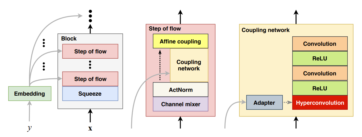 - 이때 StyleGAN과 같이 flow의 모든 step에서 각 coupling network가 share 하는 single learnable embedding $\mathbf{e}_{y}$를 도입