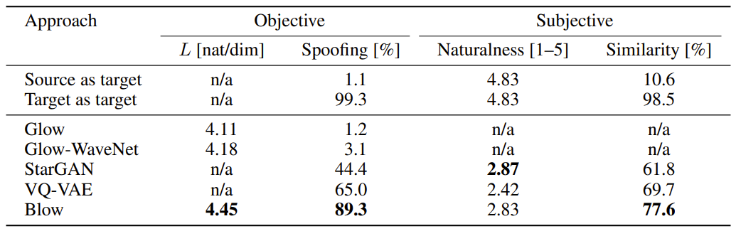 - Comparisons : Glow, Glow-WaveNet, StarGAN-VC, VQ-VAE