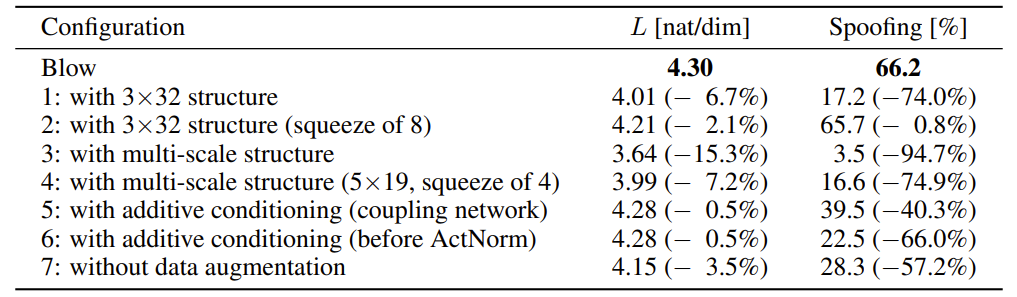 - $10^{-4}$의 learning rate, 114 batch size를 사용하여 Adam을 통해 Blow를 training 함