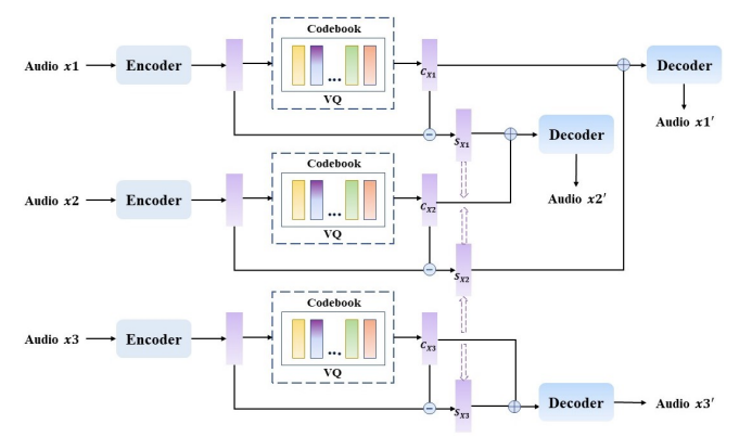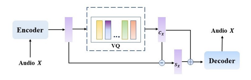 (Eq. 1) $\mathbf{C}_{x}=\text{VQ}(\text{enc}(x)),\,\,\, \mathbf{S}_{x}=\mathbb{E}_{t}[\text{enc}(x)-\mathbf{C}_{x}]$