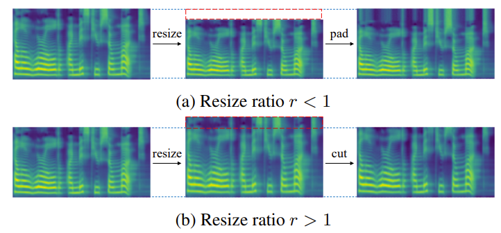 - 이때 bilinear interpolation을 사용하여 mel-spectrogram을 특정 ratio $r$로 vertically resize 한 다음, resized mel-spectrogram을 original shape로 pad/cut 하는 방식으로 동작