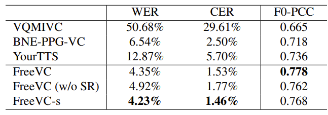 - WER, CER 측면에서도 FreeVC가 가장 뛰어남