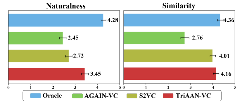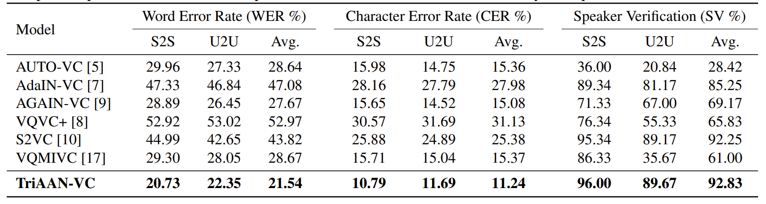 - 전체적으로 TriAAN-VC가 가장 우수한 성능을 보임