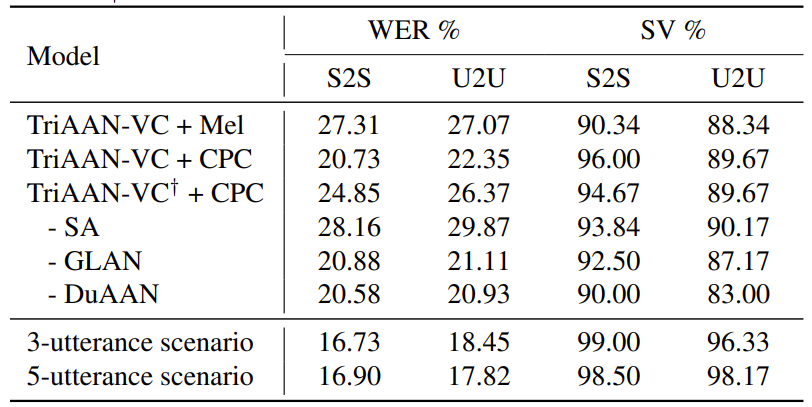- TriAAN-VC의 각 component를 대체하는 경우 성능 저하가 발생함