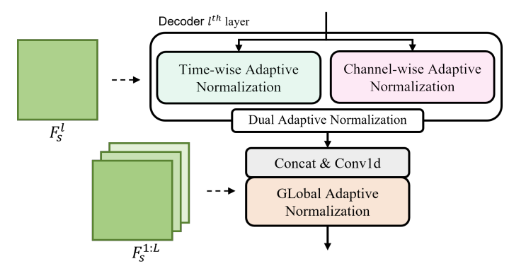 - $l=1,2,...,L$ - DuAN은 dual view (time, channel)에서 $F_{s}^{l}$의 layer-wise detailed speaker feature를 추출한 다음 adpative normalization을 적용함