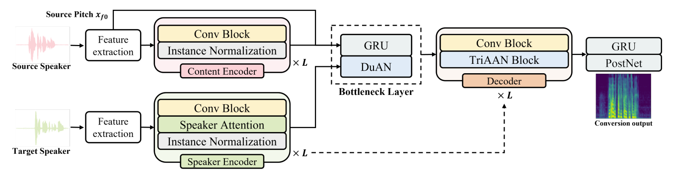 - TriAAN block은 previous layer의 content feature와 speaker encoder layer의 feature map을 사용하여 conversion을 수행 - 최종적으로 decoder output은 GRU와 PostNet을 통해 refine 되어 log mel-spectrogram $\hat{y}\in\mathbb{R}^{M\times T}$를 예측함