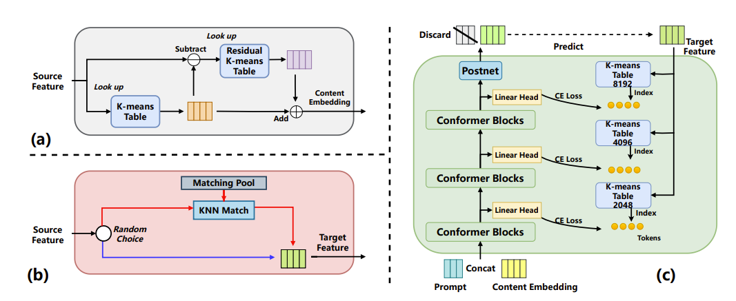 - Residual-enhanced $K$-means decoupler를 통해 3초의 target speaker prompt condition하에서 enhanced semantic feature를 얻음