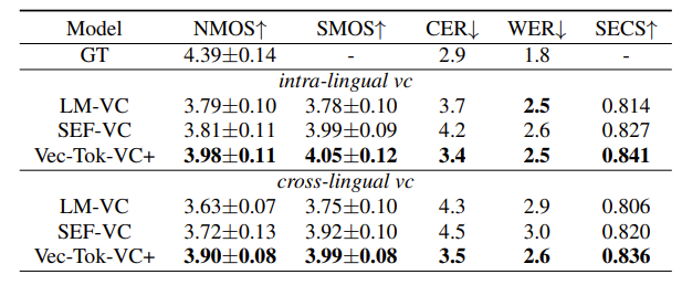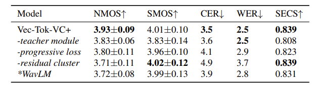 - 전체적으로 Vec-Tok-VC+의 성능이 가장 뛰어남