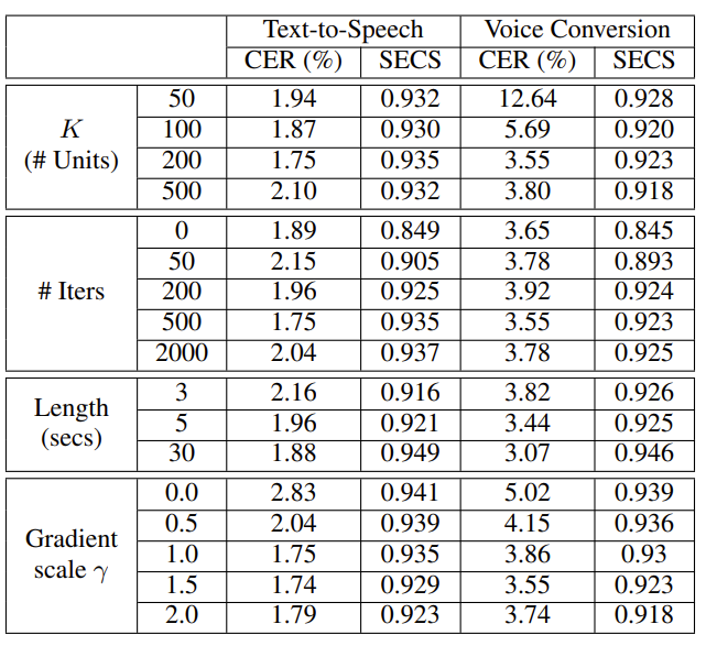 - 이때 gradient scale $\gamma$를 TTS에 대해 1, VC에 대해 1.5로 설정하면 speaker similarity 저하를 최소화하면서 pronunciation 개선을 최대화할 수 있음
