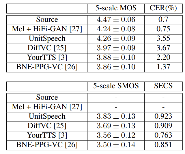 - VC task도 마찬가지로 UnitSpeech의 성능이 가장 우수함