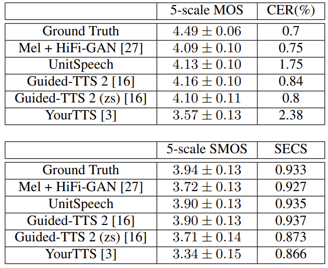 - 전체적으로 UnitSpeech가 가장 우수한 합성 품질을 보임