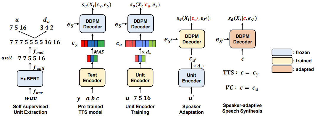 - 해당 unit encoder는 input unit을 사용하여 speech content를 diffusion decoder에 condition 하도록 training 됨 - 추가적으로 speaker adaptation을 위해 target speaker의 $\langle \text{unit, speech}\rangle$ pair를 사용하여 unit encoder로 condition 된 pre-trained diffusion model을 fine-tuning