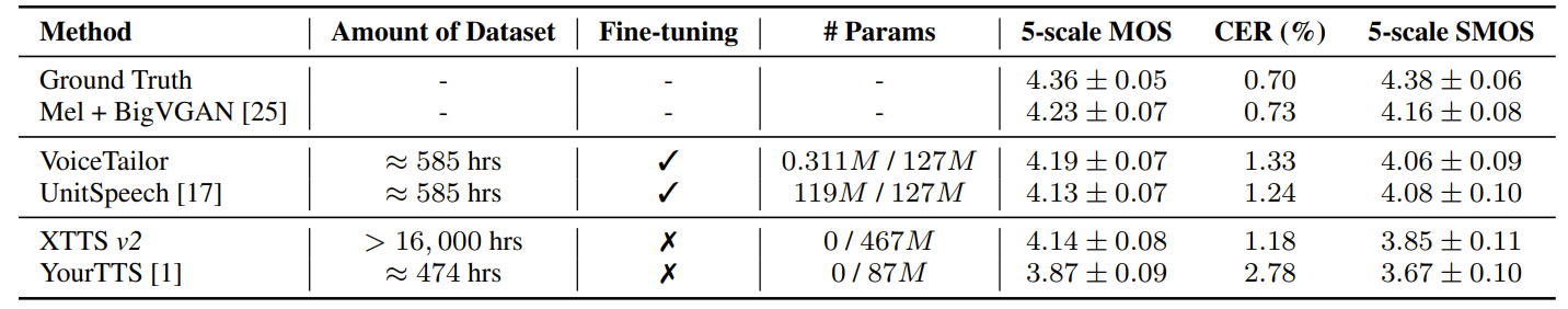 - 특히 VoiceTailor는 0.25%의 parameter만 fine-tuning 하여 UnitSpeech 수준의 speaker similarity를 달성할 수 있음