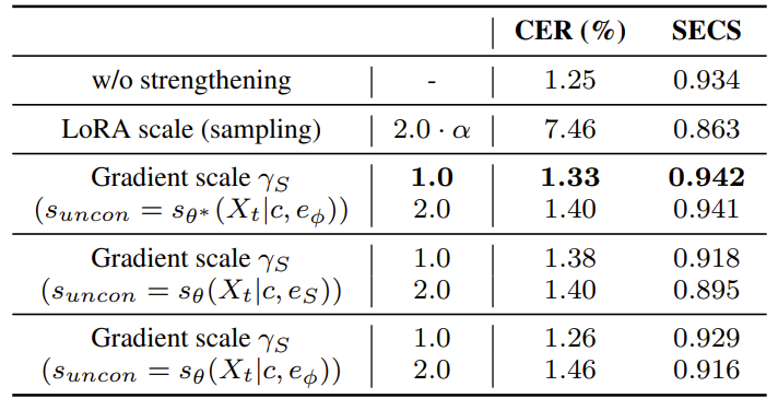 - 특히 fine-tuning에 사용된 값보다 LoRA scaling factor $\alpha$를 증가시키면 CER, SECS가 모두 저하됨