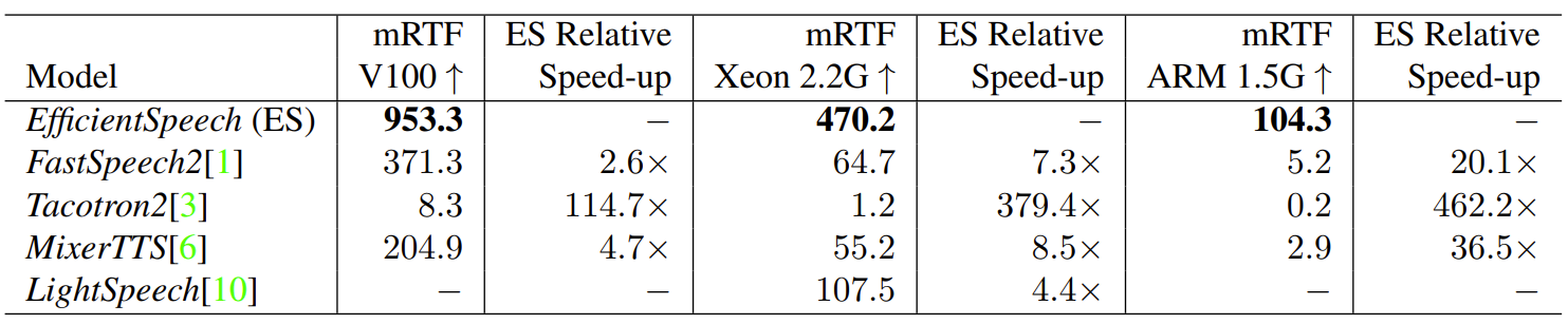 - FastSpeech2와 비교했을 때 속도는 EfficientSpeech가 20.1배 더 빠름