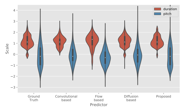 - Pitch/duration distribution을 비교해 보면 MultiVerse는 ground-truth와 비슷한 distribution을 가짐